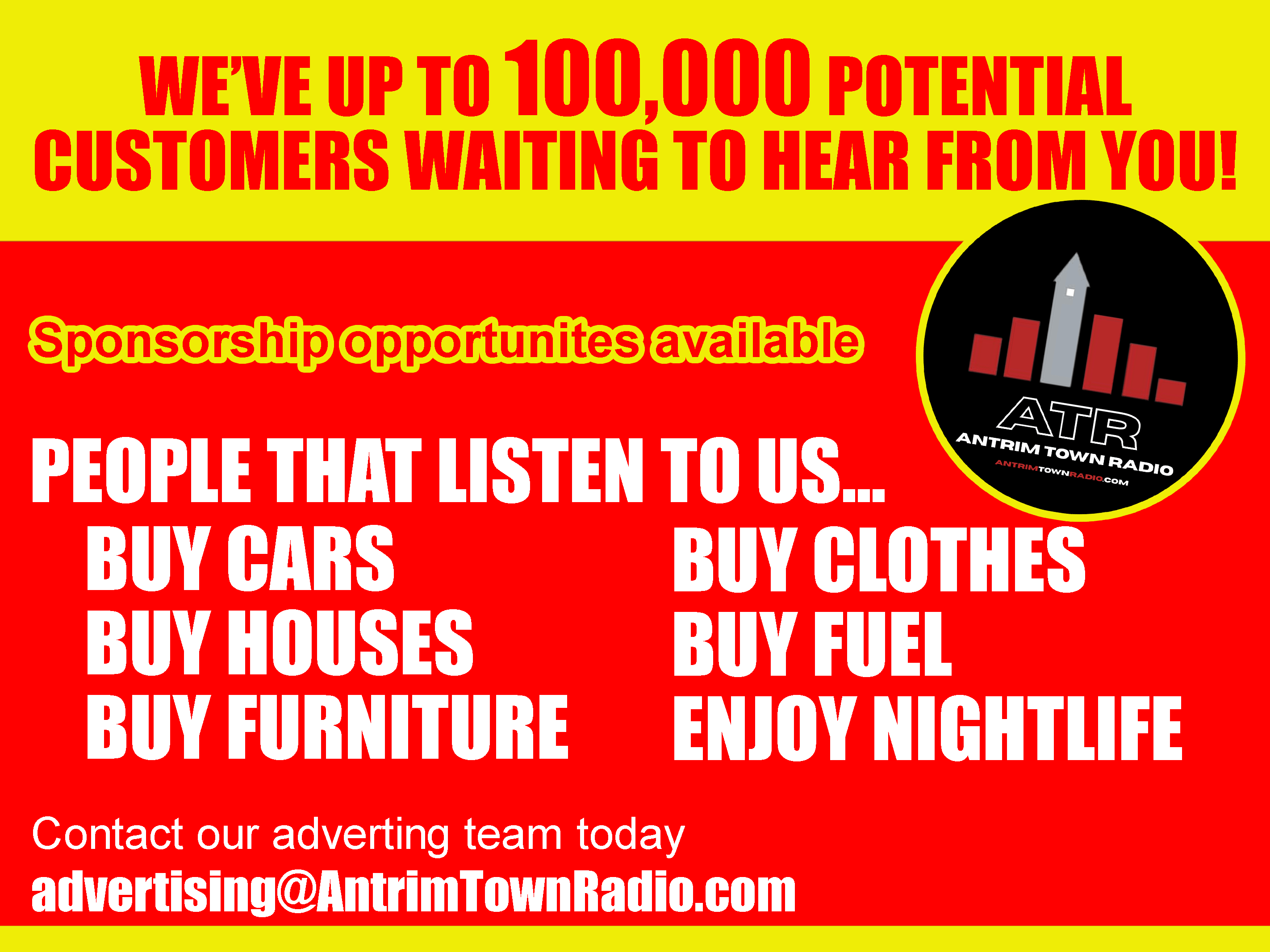 We have various advertising and sponsorship opportunities available on Antrim Town Radio. For further information please contact our sales and promotions team on advertising@antrimtownradio.com